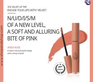 • 3CE Velvet Lip Tint #New Nude – Natural peach beige with a drop of pink