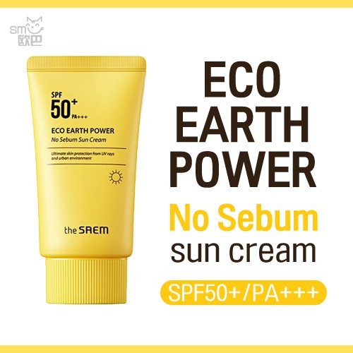Confident with any sunlight. The Saem Eco Earth Power Sun from global eco. eco earth power no sebum sun cream spf 50+ pa+++. non-greasy oil and sebum care sun cream. smooth sun cream. oil and sebum care. sun protection, whitening, anti-wrinkle. Dermatologist tested.