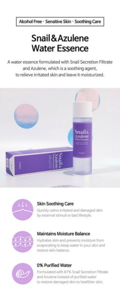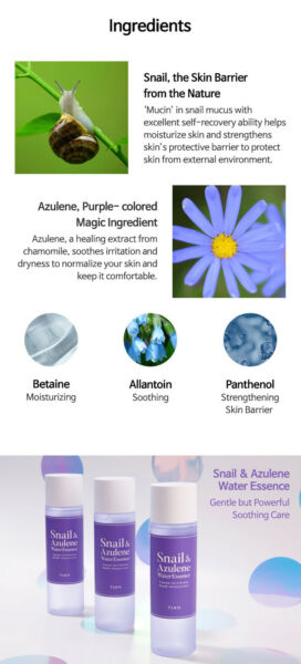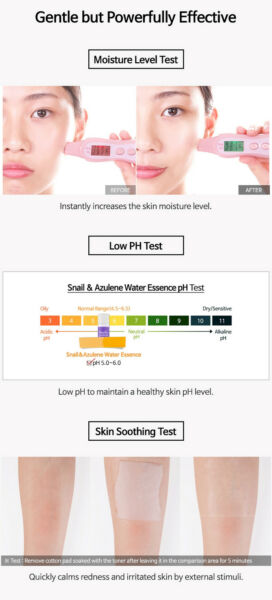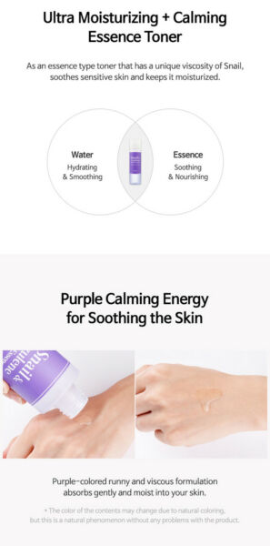 Quickly calms irritated and damaged skin by external stimuli or bad lifestyle.Hydrates skin and prevents moisture from evaporating to keep water in your skin and restore skin balance?Formulated with 87% snail secretion filtrate and azulene instead of purified water to restore damaged skin to healthier skin.